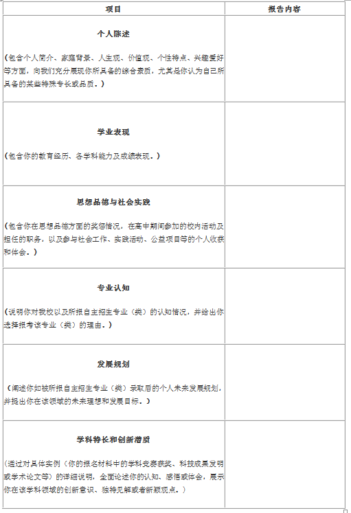 5)自主招生申请报告(须按照我校自主招生申请报告的相关要求完成)。