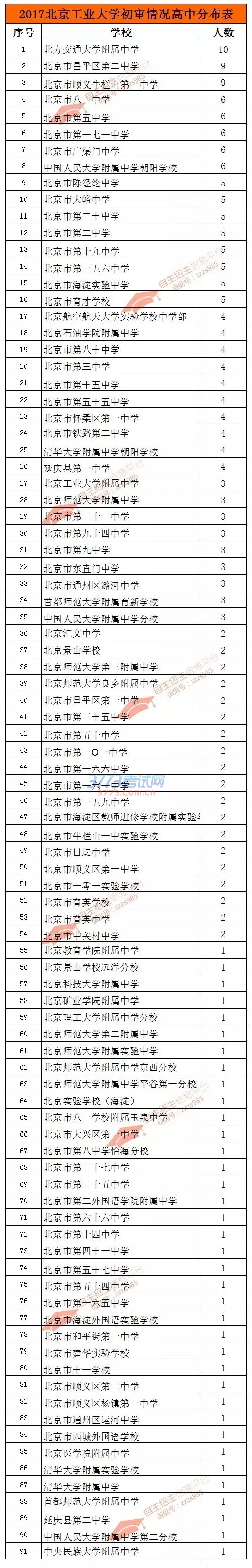 由于北京工业大学仅面向北京市进行自主招生。自主招生信息平台通过整理北京工业大学自主招生初审名单,统计出通过初审的高中分布情况,具体如下: