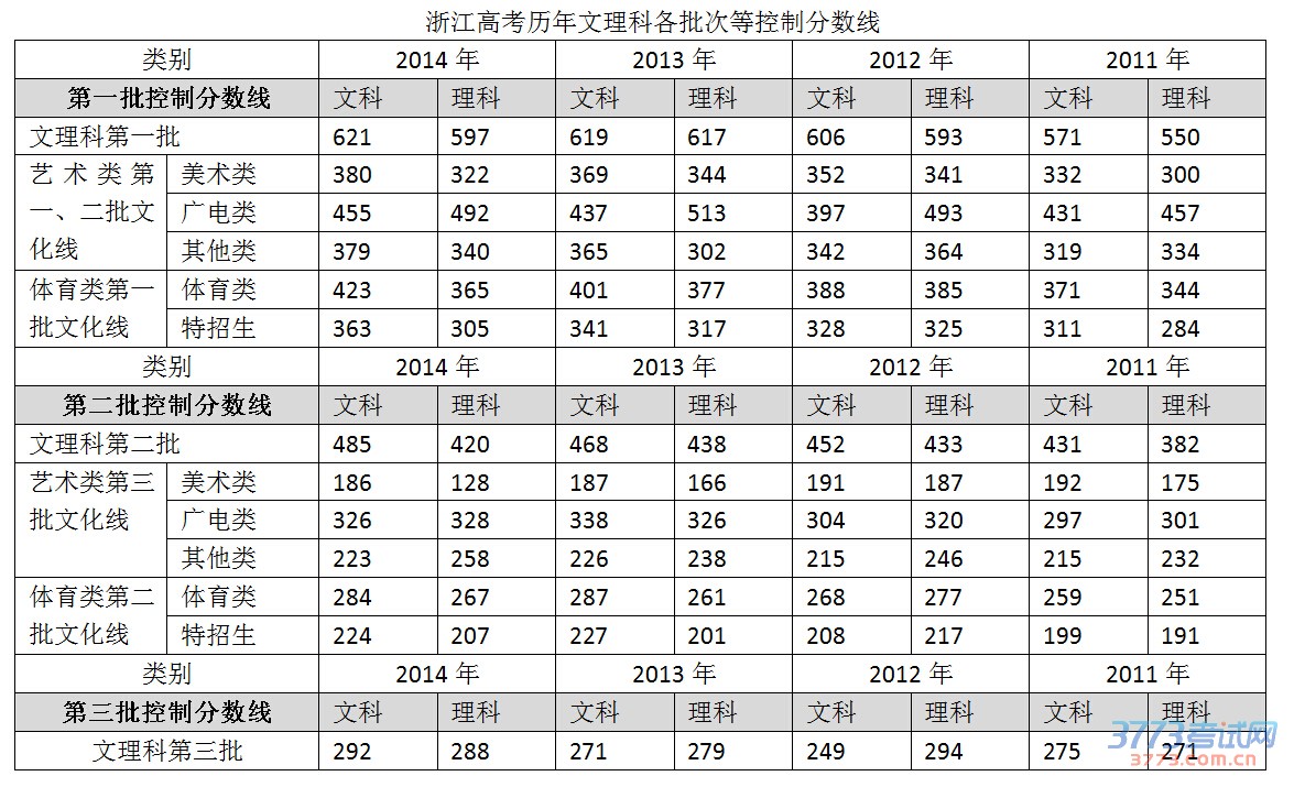 以下为2011-2014年浙江高考分数线信息。