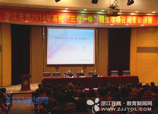 浙江省教育考试院科宣处处长鲍夏超、杭州电子科技大学招生就业处处长谢书琴、浙江工业大学招生办公室主任袁旦等三位专家光临讲座,一一为考生解读2014年浙江高校“三位一体”的招生政策及报考须知,就“何为三位一体”、“如何报考三位一体”、“三位一体的志愿填报和录取”等问题与广大考生和家长进行了面对面的交流。