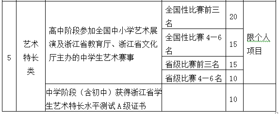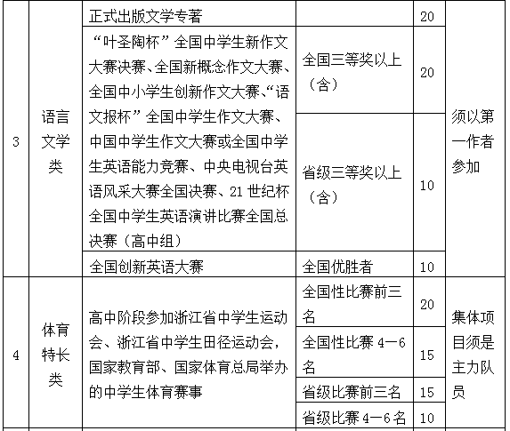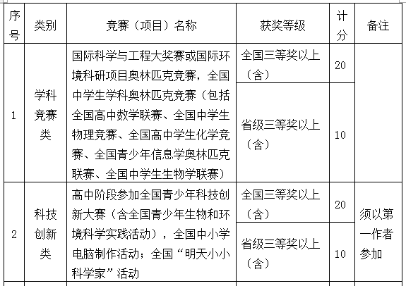 2.高中阶段在学科竞赛、科技创新、语言、体育、艺术等方面取得突出成就。符合以下条件的考生,可获得素质特长分。同一考生如符合多项素质特长,可累计,最高为20分。素质特长分以考生提供的奖状、证书为主要依据,具体由学校“三位一体”招生工作委员会研究认定。