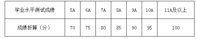 综合评价成绩=“学业水平测试(高中会考)成绩(折算成满分100分)×20%+综合测试成绩(折算成满分100分)×30%+高考总分(折算成满分100分)×50%”计算形成。其中学业水平测试(高中会考)成绩换算表如下: