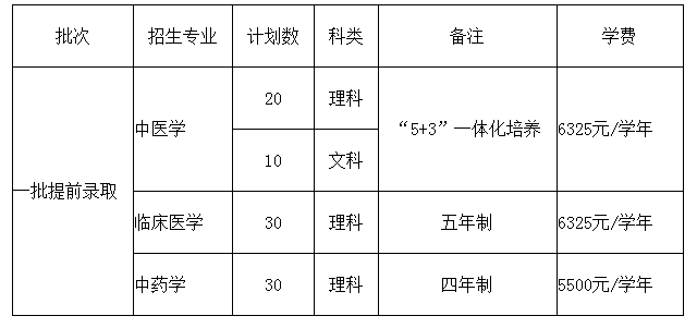 (五)报考中医学专业的考生学业水平测试(高中会考)成绩为A等的科目数低于10门,但不低于8门;报考临床医学专业的考生学业水平测试(高中会考)成绩为A等的科目数低于9门,但不低于7门;报考中药学专业的考生学业水平测试(高中会考)成绩为A等的科目数低于7门,但不低于5门,其余科目不低于C等,同时综合素质评价均不低于P等。且符合以下专项条件之一者可以报考: