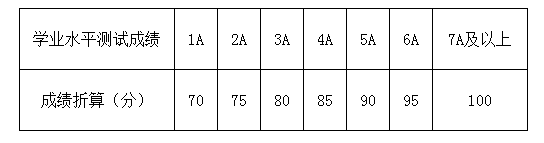 综合评价成绩=“学业水平测试(高中会考)成绩(折算成满分100分)×20%+综合测试成绩(折算成满分100分)×30%+高考总分(折算成满分100分)×50%”计算形成。其中学业水平测试(高中会考)成绩换算表如下: