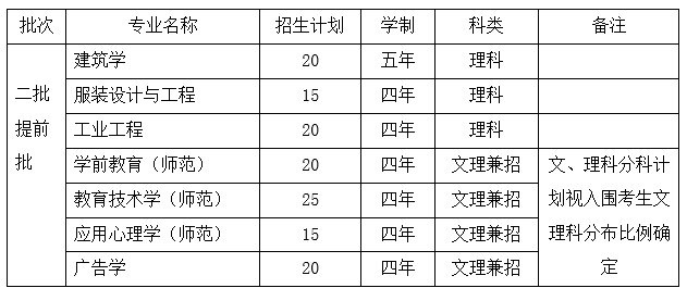 2.思想品德优良、身心健康,有志于建筑学、服装设计与工程、工业工程、学前教育(师范)、教育技术学(师范)、应用心理学(师范)、广告学专业学习的考生;