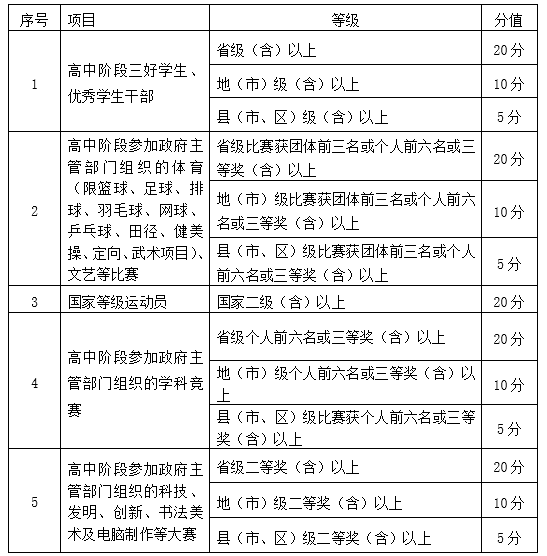 素质考评主要依据为高中阶段竞赛及获奖情况,凡符合下列条件之一者,可在素质考评中获得相应的考评分,同一考生同类项只取高分项;不同类项可累加,但累加最高不超过20分。