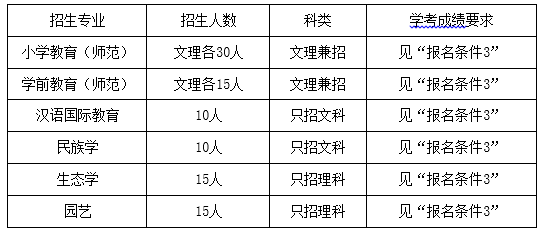 (三)专业志愿填报、投档录取办法。专业志愿可以兼报。文科考生可以填报学前教育、小学教育、汉语国际教育、民族学四个专业;理科考生可以填报学前教育、小学教育、生态学、园艺四个专业。文理科不得跨科填报。“三位一体”招生录取的考生,第一学期不能转专业;一学期后,学业成绩在同专业同年级学生中排名前10%的,可以根据学校相关规定申请转专业。
