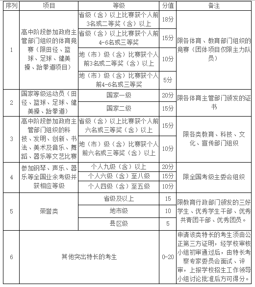 申请该类特长的考生须由公正第三方证明,经学校审核小组初审通过后,由特长考察专家委员会面试、评审,上报学校招生工作领导小组讨论批准后方可得分。