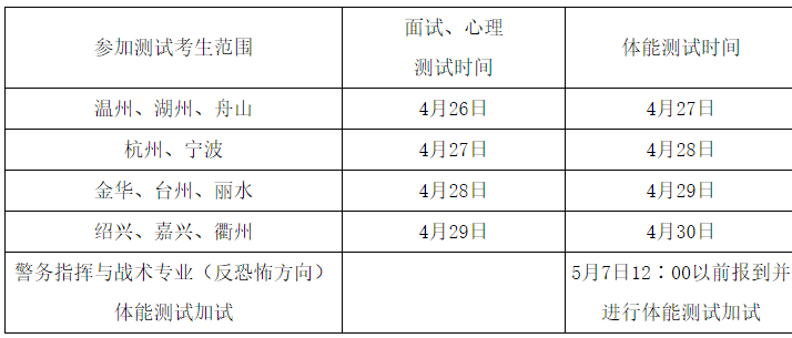 根据警察素质要求,报考浙江警察学院的考生,必须参加由学校在高考前组织的综合测试。综合测试包括面试、心理测试、体能测试,其中面试、心理测试、体能测试中任何一项不合格均为综合测试不合格。