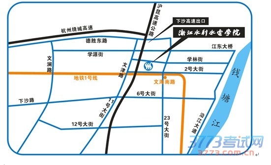 乘坐地铁(地铁1号线)来我校的考生,到文海南路站下车即可。自行驾车来我校的,宁波、温州、绍兴、台州、丽水、金华等杭州以南市、县的可从绕城高速公路东线至下沙出口直达学校;杭州以北和以西的市、县可从绕城高速北线到下沙出口直达学校。
