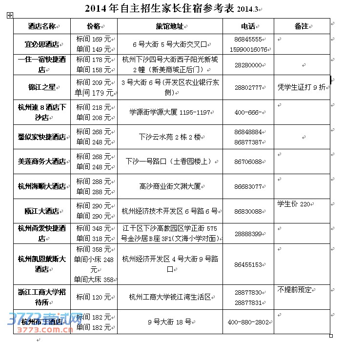 注: 表中价格仅供参考,请以酒店公布价格为准。
