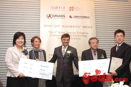 (2007年3月22日,北京讯)在第四届“清华-杜孟传播奖学金”颁奖典礼上,清华学生李恬(最佳创意奖得主)和仇檀(优秀策划案奖得主)分别获得了赴瑞士日内瓦和泰国曼谷的联合国艾滋病规划署实习3个月的机会。基于“如何提高新闻和传播专业人员职业道德”这一主题,另外还有其他四名学生由于提交了颇有质量的论文而获得了励志奖。