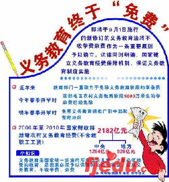 在2006至2010年5年内,中央和地方各级政府将累计新增农村义务教育经费2182亿元,全部免除农村义务教育阶段学生学杂费,对贫困家庭学生提供免费教科书并补助寄宿生生活费,提高公用经费保障水平,建立校舍维修改造长效机制,巩固和完善农村中小学教师工资保障机制。>>>详细