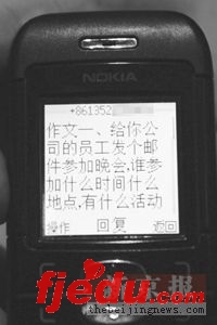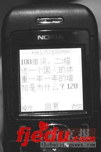 昨(24)日,李丽(化名)向记者展示她在早上6时许收到的手机短信,短信内容是公共英语考试三级作文题目。记者 韩萌 摄