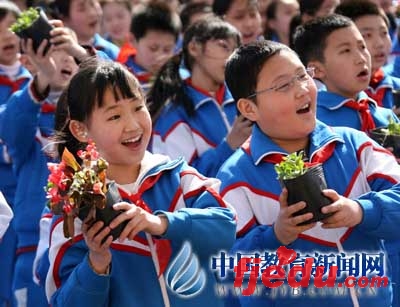 资料图片:“朵朵鲜花,颗颗心那,献给朋友,献给世界,献给太阳……”歌声在北京丰台区第五小学校园里由学生们传唱着。3月26日,在北京2008年奥运会倒计时500天到来之际,该校举行了“我为奥运献盆花”活动启动仪式。活动中,师生踊跃领取由北京园林科学研究所赠送的“奥运花卉”,教师将把培育花苗与课堂学习结合起来,组织学生观察花苗成长经过,丰富科学知识,以实际行动践行“绿色奥运”。(记者 樊世钢 摄)