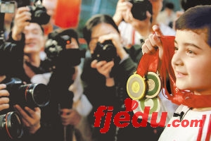 照片:3月27日,8岁的维吾尔族小歌手阿尔法向记者展示2008年奥运会金银铜牌。 本报记者 刘占坤摄