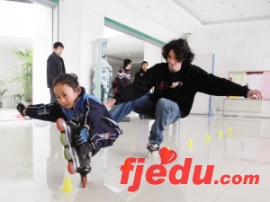 29日中午,外语学院逸夫教学楼内摆上了一排排黄色桩子,法国轮滑世界冠军圣巴斯蒂安与天津轮滑爱好者的交流表演在这里进行。