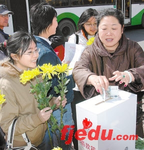 3月31日,一名前来扫墓的女士向“红十字书库”捐款后得到志愿者送上的一束鲜花。当日,在北京八宝山地铁口,十余名志愿者和红十字书库的工作人员义卖扫墓所需的菊花,所得款项将捐献给红十字书库公益事业,用来帮助贫困地区缺少书籍的孩子。