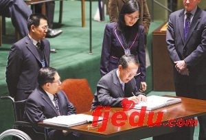 新华社联合国3月30日电(记者刘历彬王湘江)《残疾人权利公约》开放签署仪式30日在纽约联合国总部举行,中国常驻联合国代表王光亚代表中国在该公约上签字。