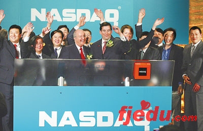 4月3日晚,纳斯达克CEO鲍勃·格雷菲尔德和在纳斯达克上市的中国公司高管在北京通过远程遥控,共同敲响开市钟,庆贺越来越多的中国公司登陆纳斯达克。这是美国证券交易所首次在中国举办开市仪式,该盛况同时向全世界进行转播。统计数据显示,截至目前,共有来自中国不同行业的40家公司在纳斯达克交易所挂牌上市,总市值约为300亿美元,中国成为纳斯达克的一个重要市场。本报记者赵青摄