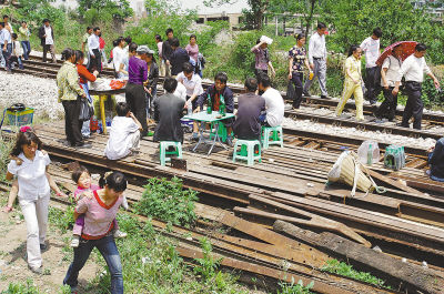 4月19日,行人在川黔铁路贵阳北站路段的铁道上行走。当日,人们为抄近路参加贵阳市云岩区圣泉“三月三”民族艺术节,竟不顾人身安全,随意在铁路上行走。为确保列车安全运行,有关部门调集了70余名预备役人员守护铁路,但仍无法阻挡人们的危险行为。吴东俊摄(新华社发)