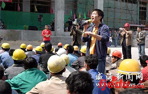 演出结束后,哈工大(威海)汽车工程学院辅导员咸丰刚说,“五一”就要到了,但愿这次演出能让民工朋友过上一个快乐的劳动节,今后如有机会,还将把舞台搭进更多的建筑工地。