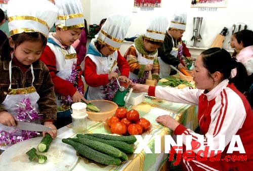 4月30日,幼儿园的孩子们在劳动课上学做蔬菜大餐。“五一”前夕,江苏淮安市一家幼儿园开设“劳动最光荣”主题课,通过辨识劳动工具、实物操作等系列活动,增强孩子们从小热爱劳动、珍惜劳动成果的意识。新华社发(叶首卫摄)
