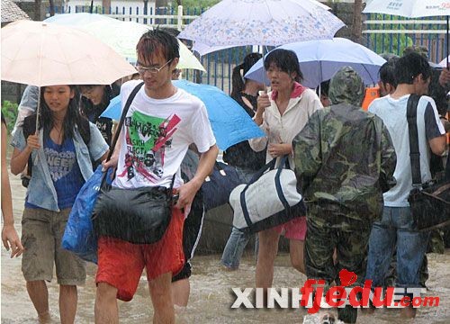 8月19日,受洪水围困的学生纷纷冒雨转移。