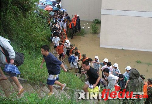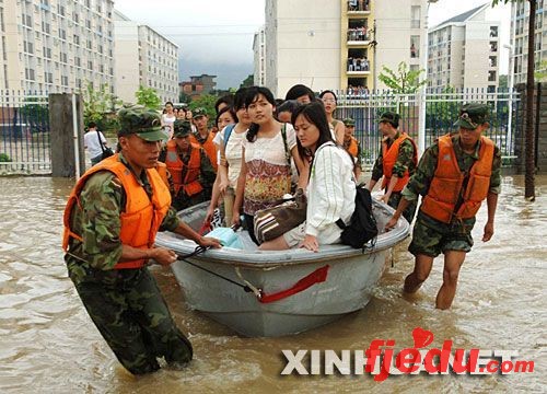 8月19日,南京军区驻闽某舟桥团官兵正在紧急疏散被困学生。
