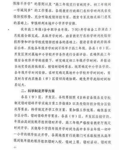 长春市高三年级(含中职毕业年级)开学准备工作须在3月底全部完成。具体开学时间,由省教育厅在研判疫情防控形势、评估学校防疫工作准备基础上,后公布。