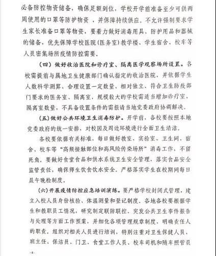 优先做好防护口罩、体温计、消毒剂等必备防控物资储备,学校开学前准备至少可供两周使用的口罩等防护物资,保障持续供应。
