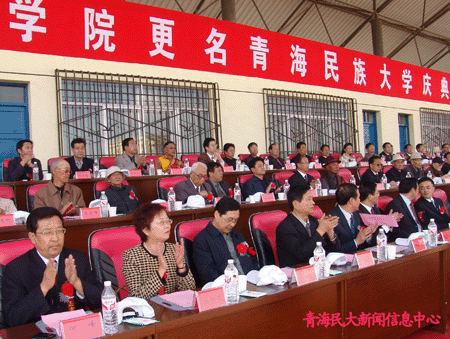 省委书记、省人大常委会主任强卫发来贺信,全国政协学习与文史资料委员会副主任桑结加,省政协主席白玛,省委常委、宣传部长曲青山,省人大常委会副主任桑杰,副省长邓本太,原省政协副主席蒲文成,省委教育工委书记、教育厅厅长王予波,省民宗委主任普日哇,省编办主任韩德荣,省政府副秘书长吴庆生、马骥等有关领导出席庆典。省内兄弟院校负责人,我校校友代表、学校历任领导、国家和省级专家代表以及全校师生员工1万余人参加大会。大会由青海民族大学党委书记熊敦邦同志主持。