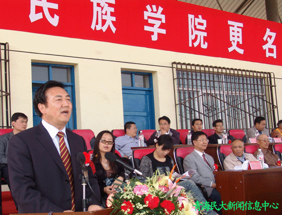 青海民族大学党委副书记、校长何峰在致辞中满怀深情地回顾了青海民族大学建校60年来在上级的高度关怀和社会各界的大力支持下取得的办学成就,展望成功更名后的青海民族大学将在提高教育教学质量、落实人才强校战略等十个方面推进学校的全面发展,切实完成紧跟时代要求,担当历史重任,服务民族振兴的重要课题。