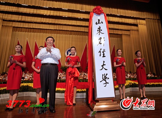 上午11:50,在庄严的乐曲和热烈的掌声中,省委副书记、省长姜大明为山东财经大学揭牌,全场欢声雷动。