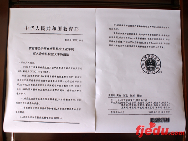 附《教育部关于同意南昌航空工业学院更名为南昌航空大学的通知》 江西省人民政府: 你省《关于恳请将南昌航空工业学院更名为南昌航空大学的函》(赣府文[2005]116号)收悉。 根据《高等教育法》和《普通本科学校设置暂行规定》的有关规定以及全国高等学校设置评议委员会五届一次会议的评议结果,经研究,同意南昌航空工业学院更名为南昌航空大学,学校代码为10406;同时撤消南昌航空工业学院的建制。现将有关事项通知如下: (一)、南昌航空大学系多科性本科学校,以本科教育为主,同时承担研究生培养的任务。 (二)、南昌航空大学由你省领导和管理,其发展所需经费由你省安排解决。 (三)、该校全日制在校生规模暂定为16300人。 (四)、该校现有专业结构的调整和新专业的增设,应按我部有关规定办理。 望你省加强对该校的领导,进一步明确学校的定位,科学进行总体规划,落实有关投入,加强学科建设,积极开展科学研究,努力提高教学质量、科研水平和办学效益,办出特色,办出水平,为国防科技工业发展和江西省经济发展社会进步作出更大的贡献。