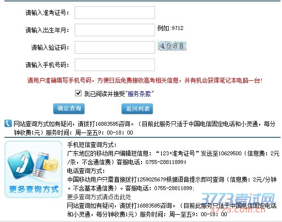 1.广东地区移动、联通用户编辑短信息:123+12位准考证号+4位出生年月,发送至10629500,即可预订或查询高中学业水平成绩。(信息费:2元/条,不含基本通信费)客服电话:0755-28811899;
