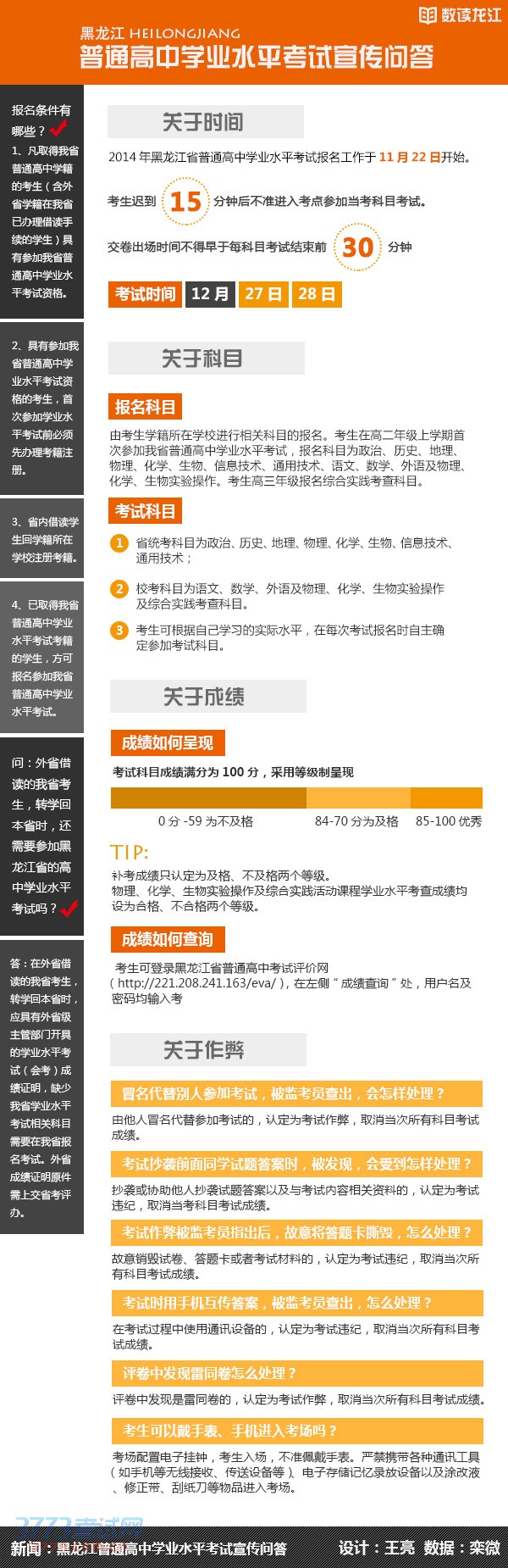 东北网11月24日讯 (记者栾微 王亮) 记者今天从省招办获悉,2014年黑龙江省普通高中学业水平考试报名工作于11月22日开始,考试时间为12月27、28两天。今年我省普通高中学业水平考试将全部在标准化考点进行。考试报名条件、考试科目及阅卷标准等详细内容,详见下图。