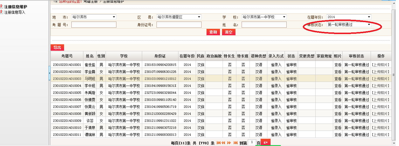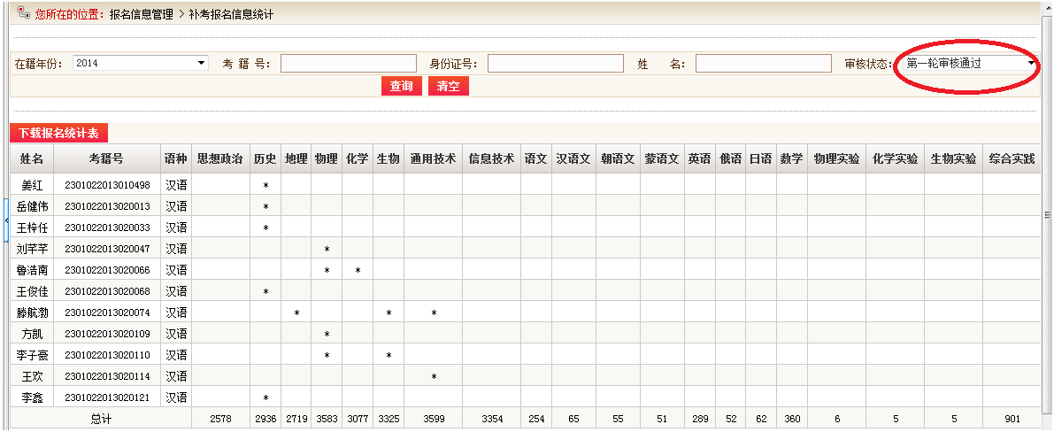选择在籍年份2014,审核状态:选择“第一轮审核通过”点击查询,请各个学校核对各个学生的报名信息