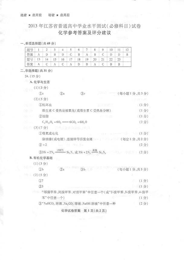 2013年江苏省普通高中学业水平测试(必修科目)试卷化学(含答案