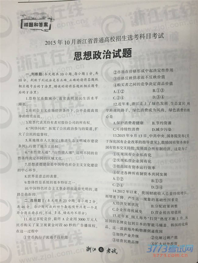 [组图]2015年10月浙江新高考学考选考政治试题及答案