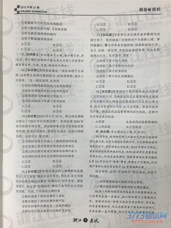[组图]2015年10月浙江新高考学考选考政治试题及答案