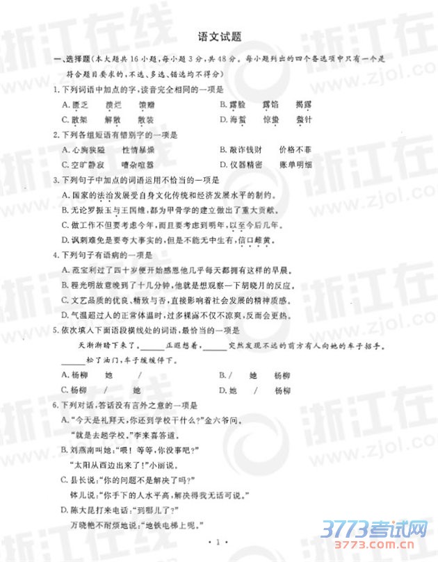 [组图]2015年10月浙江新高考学考选考语文试题及答案