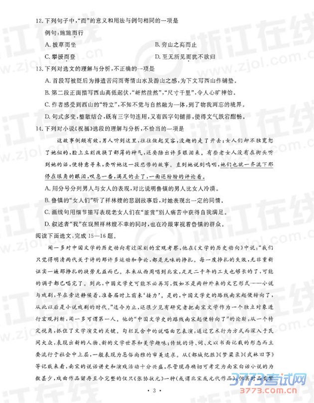 [组图]2015年10月浙江新高考学考选考语文试题及答案