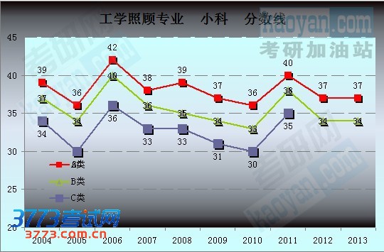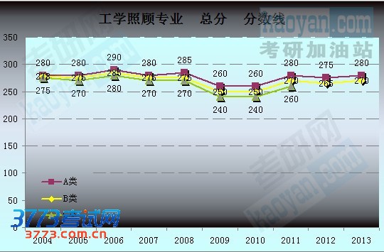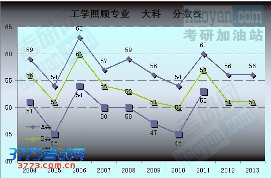 为让广大研友能更方便快捷地对比历年分数,考研网特汇总2004年至2013年工学照顾专业的国家复试分数线数据,制成下图,希望能更清晰直观的展示工学照顾专业历年的分数线走势。