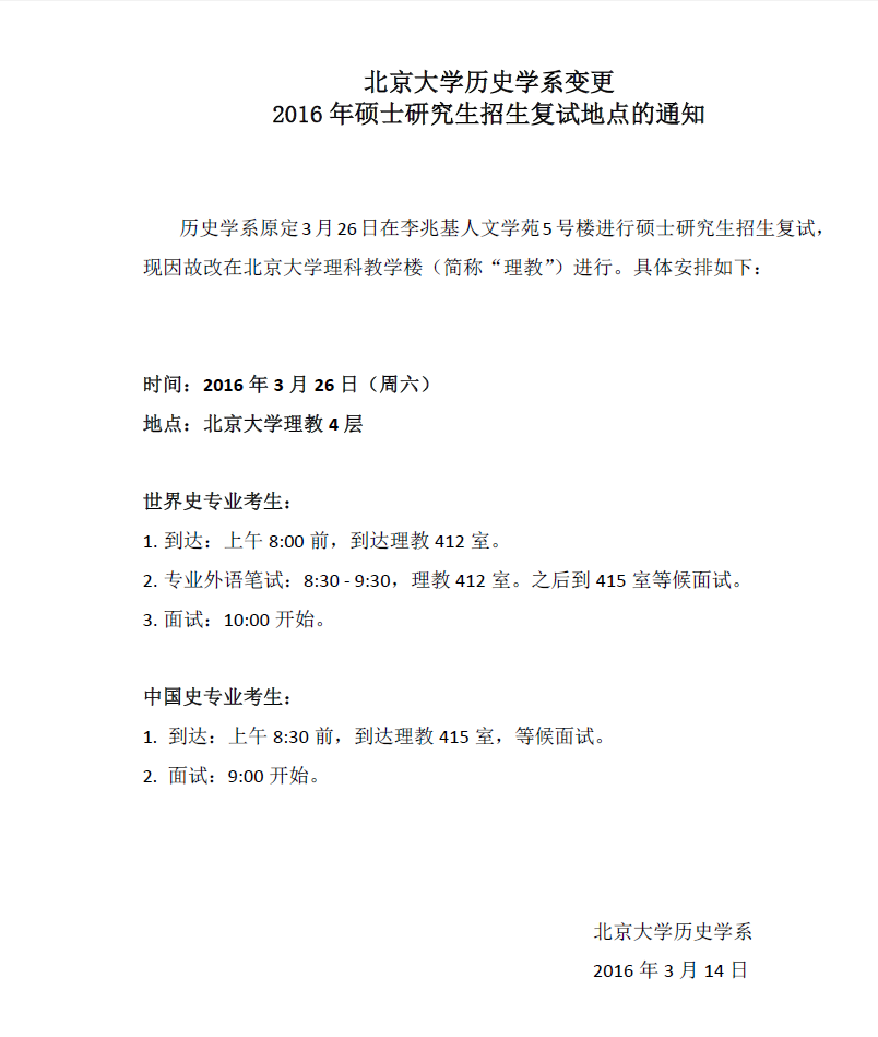 [图文]2016年北京大学历史学系考研变更复试地点的通知