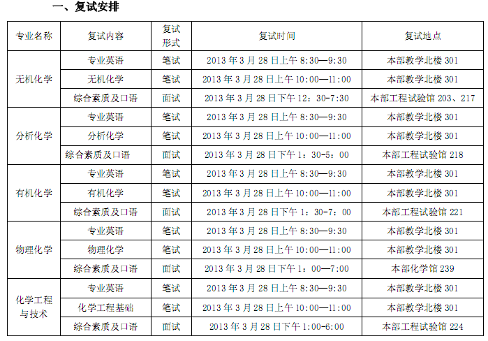 2.报考专业为化学系各专业且初试成绩过线的考生包括参加系内调剂的考生按时参加相应专业复试,不另行通知。