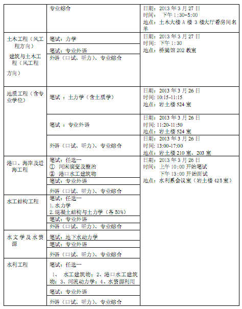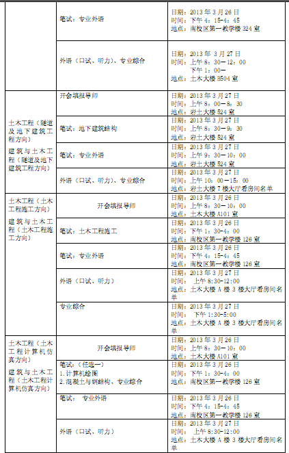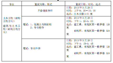 1、符合土木工程学院各专业 2013年硕士复试分数线基本要求的考生,在规定时间到下列各专业参加复试。考生可到研究生院招生网或土木工程学院网上查询复试分数线。