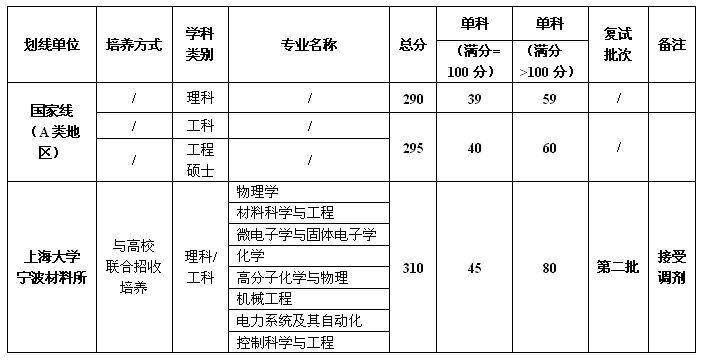 备注:与高校联合招收的合培生如总分在320分以上,允许有一门单科成绩比所内现行划定的复试分数下降5分。