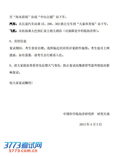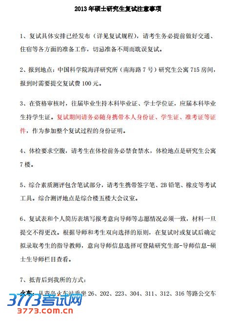 [组图]中科院海洋研究所2013年考研复试注意事项