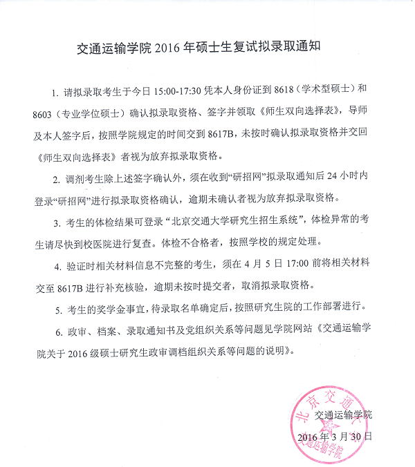 [组图]北京交通大学交通运输学院2016年拟录取通知及名单公示